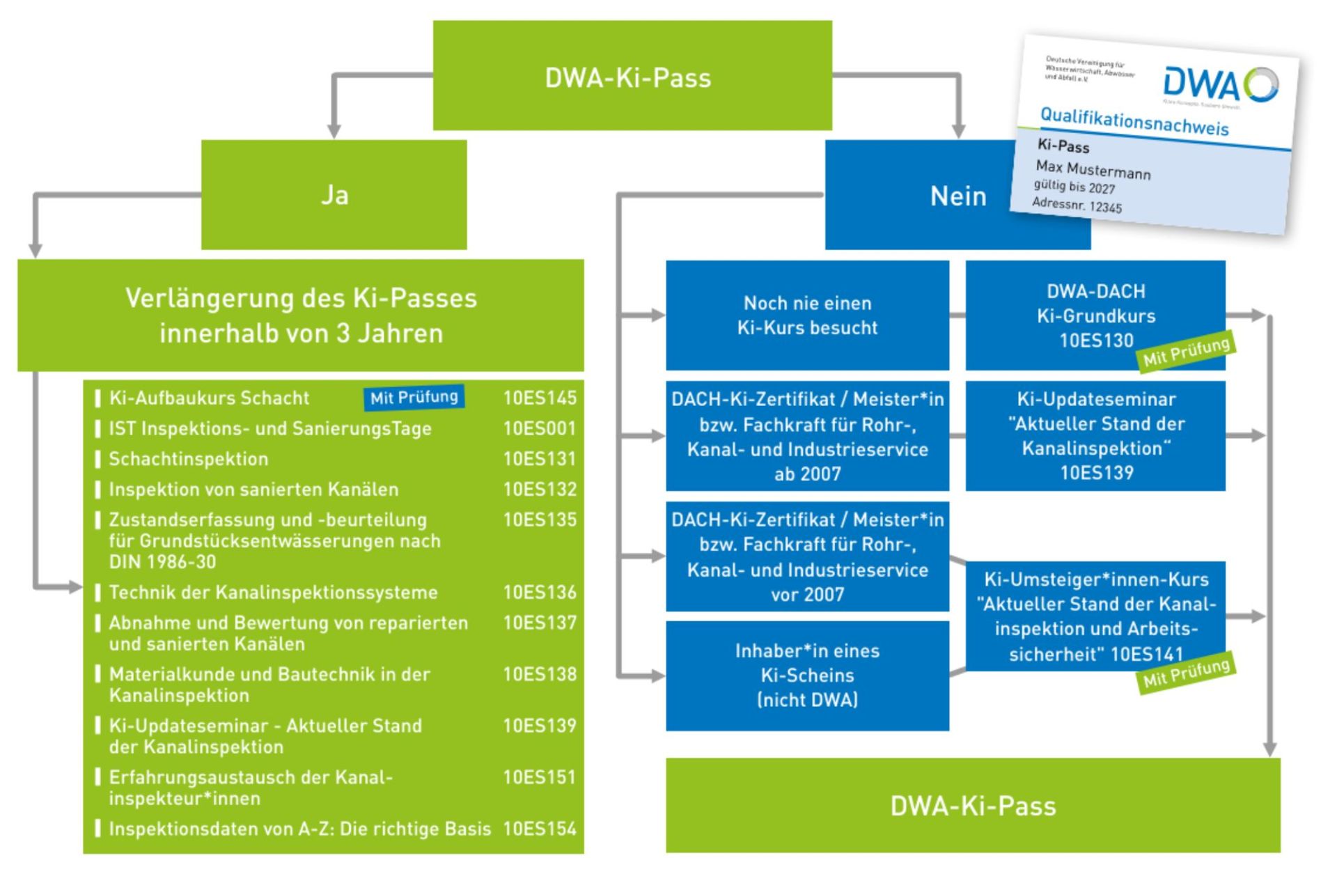 regelmäßig, maximal alle drei Jahre, fort- und weiterbilden. Aus diesem Grund führte die DWA 2012 den Ki-Pass ein. So haben alle erfolgreich bestandenen Teilnehmerinnen und Teilnehmer einen regelkonformen Nachweis in der Hand, der beweist, ihr Wissen ist auf dem aktuellen Stand. Wer den Ki-Pass verlängern möchte, muss innerhalb von 3 Jahren eine mindestens eintägige Veranstaltung besuchen.
