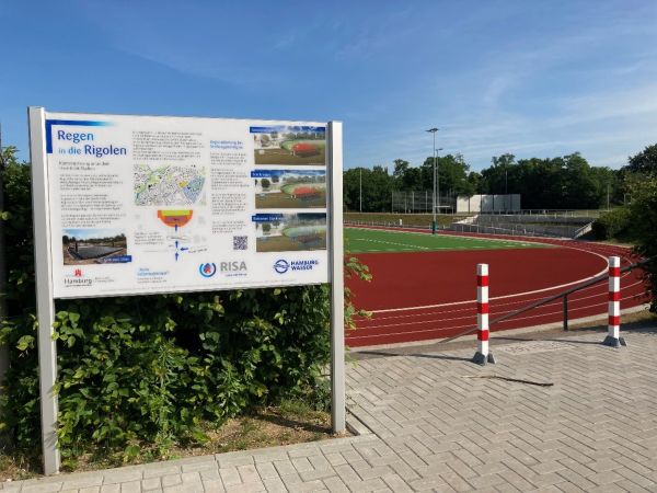 Das Hein-Klink-Stadion schützt als multifunktionale Fläche den Stadtteil Hamburg-Billstedt vor Überflutungen nach Starkregen, indem unterirdische Notrigolen für eine ortsnahe Versicherung und Speicherung des Regenwassers unterhalb der Anlage sorgen. Im Falle eines außergewöhnlich heftigen Starkregens, der die Kanalisation zum Überlaufen bringen würde, nehmen sie bis zu 500 Kubikmeter Regenwasser auf und entlasten auf diese Weise den vorhandenen Regenwasserkanal deutlich. Das dort gespeicherte Regenwasser kann ortsnah versickern und wird so wieder dem natürlichen Wasserhaushalt zugeführt. Bei besonders außergewöhnlichen Starkregen, kann der Sportplatz selbst noch mehr Regenwasser an der Oberfläche aufnehmen und anstauen. Die Anlage wurde im Rahmen des Gemeinschaftsprojektes RISA (RegenInfraStrukturAnpassung) der Behörde für Umwelt und Energie und HAMBURG WASSER entwickelt und wurde innerhalb des Modernisierungsprogramms für Sportanlagen vom Bezirk Hamburg-Mitte umgesetzt.