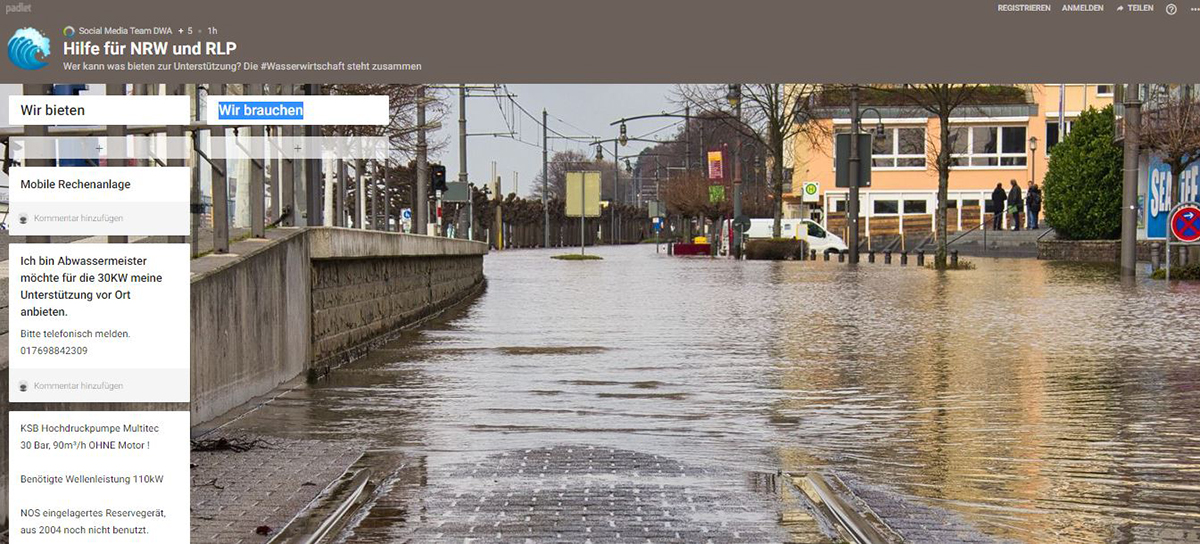 Hennef. Die DWA Deutsche Vereinigung für Wasserwirtschaft, Abwasser und Abfall hat eine digitale Vermittlungsplattform für Hilfsangebote, Anlagentechnik und Personal online gestellt. Jede von der Hochwasserkatastrophe betroffene Organisation/Kommune/Verband/Unternehmen kann den konkreten aktuellen Bedarf direkt auf dem Padlet eintragen. Gleiches gilt für Hilfsangebote, auch diese können direkt auf dem Padlet vermerkt werden. „Die DWA möchte ihr großes Netzwerk nutzen, um Hilfesuchende und Hilfebietende in der Wasserwirtschaft unbürokratisch und pragmatisch zusammenzubringen. Den Unternehmen in den Katastrophengebieten muss und wird schnell geholfen werden, die Wasserwirtschaft hält auch in Krisenzeiten fest zusammen, betont Johannes Lohaus, Sprecher der Bundesgeschäftsführung der DWA.