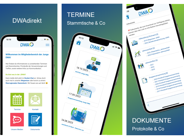 Der Mitgliederbereich der Jungen DWA in DWAdirekt vernetzt alle 1.900 JDWA-Mitglieder miteinander. Er ermöglicht den Empfang der JDWA-Mitgliederinformation, die Einsicht über alle Termine und Zugriff auf Dokumente der Jungen DWA.
