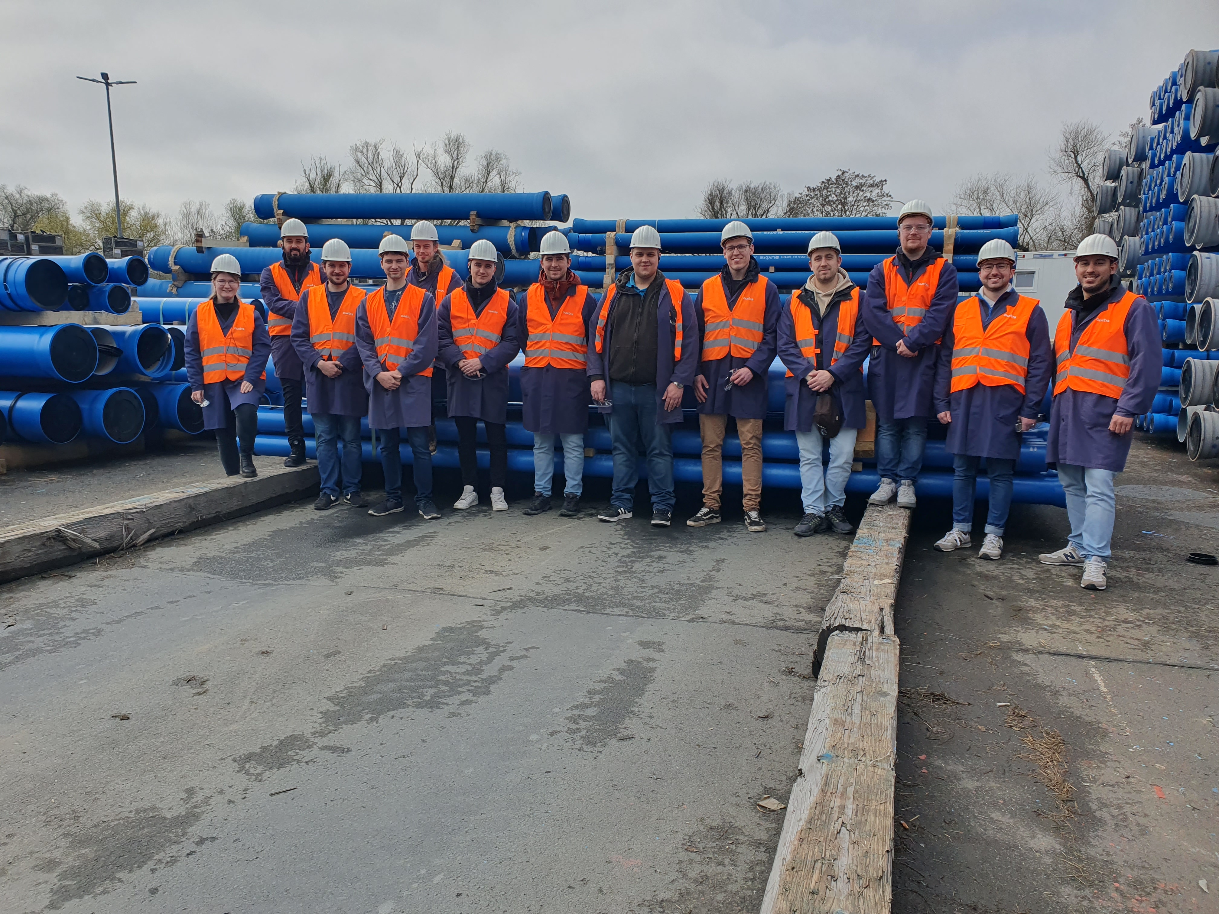 Im Anschluss an die Präsentation wurden wir durch das Werk geführt und konnten die Herstellungsprozesse hautnah miterleben. Von der Schmelzanlage mit Magnesiumbehandlung über das Kokillenlager und die Sandkernfertigung bis hin zur Gießerei konnten wir jeden Schritt verfolgen. Besonders beeindruckend war das Schleudergießen der Rohre, das wir von einer Brücke aus beobachten konnten. Nach der Gießerei führte uns der Rundgang zur Verzinkung, Druckprüfung und der Zementauskleidung bzw. -ummantelung. Nach Abschluss der Führung wurden wir zu einem Mittagessen in der Kantine eingeladen, wo wir uns ausgiebig über die gewonnenen Erkenntnisse austauschen konnten.