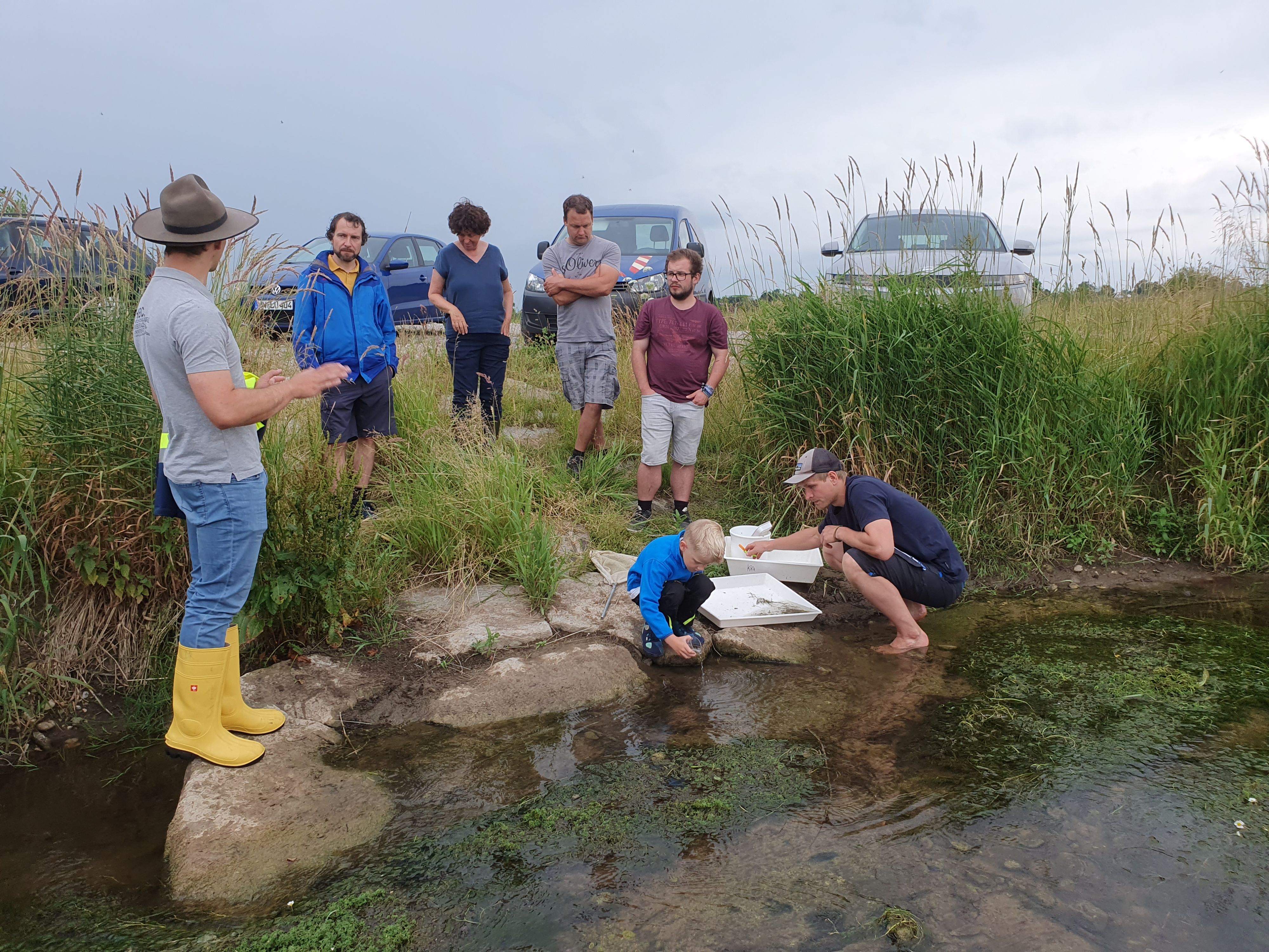 Ein Blick unter die Wasseroberfläche durfte dabei natürlich nicht fehlen. Mit Keschern und Schaugläsern bewaffnet wagten sich die TeilnehmerInnen ins kühle Nass und fanden dort neben Fischen und Egeln auch Fliegenlarven und Muscheln, die Rückschlüsse auf den ökologischen Zustand des Gewässers zulassen. So wurde das Geheimnis der Makrozoobenthos entschlüsselt und nebenbei ein neuer Altersrekord unter den Teilnehmenden aufgestellt.