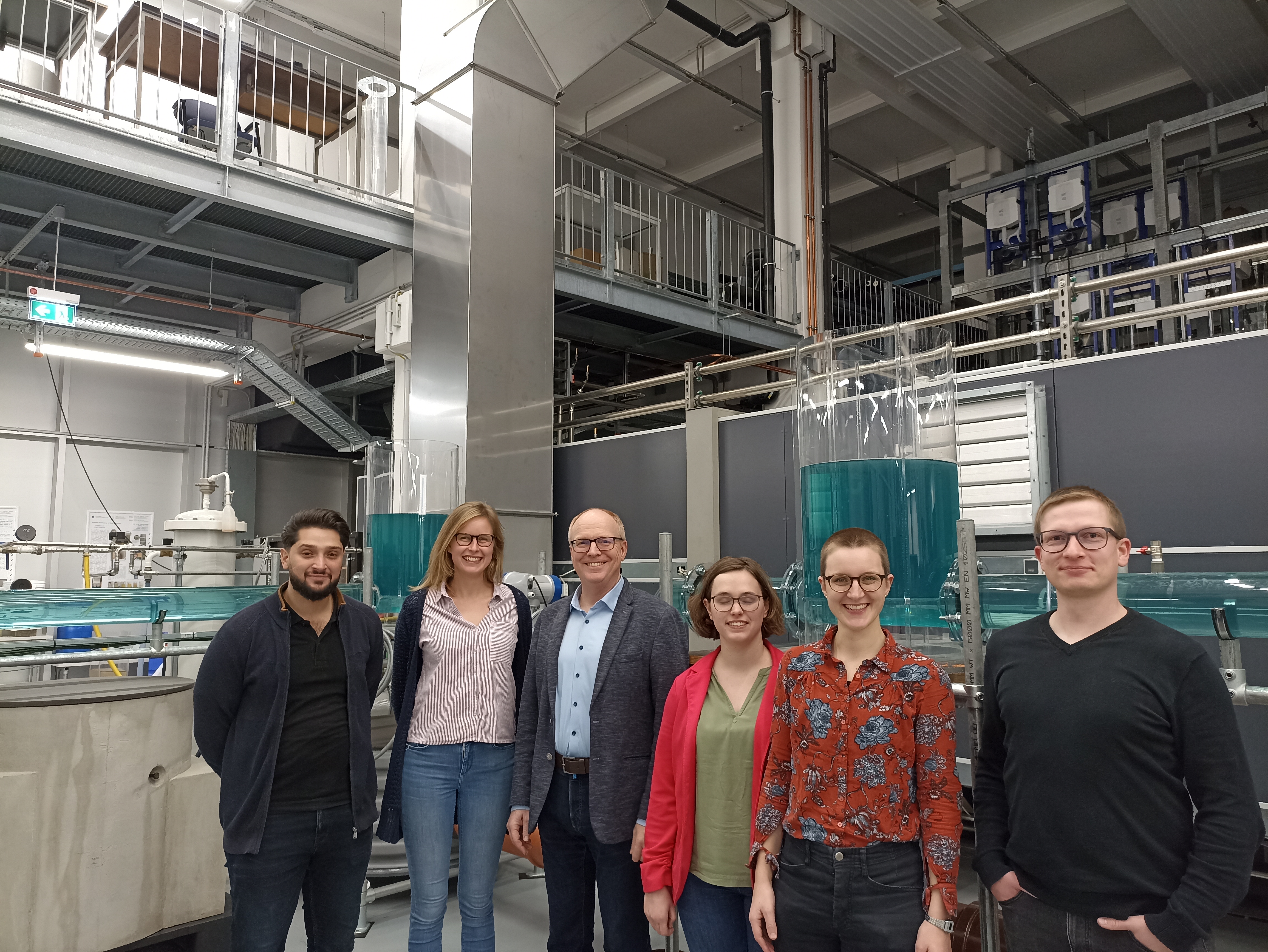 Ende November war der JDWA-Stammtisch Ruhrgebiet eingeladen, um im fernen Steinfurt das Technikum für Stadthydrologie und Wasserversorgung von Prof. Dr.-Ing. Helmut Grüning zu besichtigen. Dieser lehrt und forscht am Fachbereich Energie- Gebäude- und Umwelttechnik. Nach einer kurzen Einleitung im Besprechungsraum bei Tee und Kuchen ging es los in das beste Technikum, was wir bis dahin gesehen hatten. Herr Prof. Grüning und seine Mitarbeiterin Eske Hillbrands haben uns das gesamte Technikum gezeigt und hatten sogar kleine Aufgaben für uns vorbereitet. In diesem besonderen Technikum ist es möglich anschaulich zu lernen: in einem halbtechnischen Modell eines Kanalnetzes haben wir nicht nur das Gesetz der kommunizierenden Düker verstanden, sondern konnten auch in einem Regenbecken das Absetzverhalten von Partikeln beobachten. Hierzu wird an der FH u. a. mithilfe von Computational Fluid Dynamics geforscht, damit Regenklärbecken praxistauglich bemessen und simuliert werden können. Für die Praxis haben wir dann noch gelernt, wie wichtig eine Rückstausicherung für den Hausanschluss sein kann. Die Augmented Reality Sandkiste hat veranschaulicht, welche Gebiete bei Starkregenereignissen besonders betroffen sind. Spannend war auch die Kamerafahrt durch einen präparierten Kanal im Technikum. Hier bestand die Aufgabe darin, alle Schäden zu erkennen - von Schädlingsbefall bis zu Rissen war alles dabei. Zum Abschluss wurden wir von Herrn Prof. Grüning und seiner Mitarbeiterin Eske Hillbrands zum Pizzaessen eingeladen. Wir bedanken uns für den schönen Besuch und die anschaulichen Erklärungen zu den zahlreichen Versuchsstrecken und empfehlen den Besuch dieses Technikums weiter.