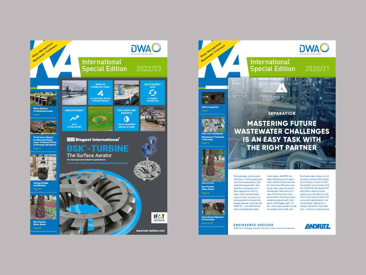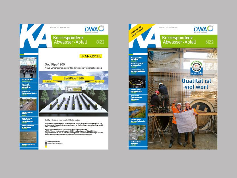 Die Verbandszeitschriften KA Korrespondenz Abwasser, Abfall für den Abwassersektor und die KW Korrespondenz Wasserwirtschaft für allgemein wasserwirtschaftliche Themen erscheinen monatlich.